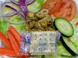 Lettuce with tomatoes, onions, carrots, green olives, and cucumbers.